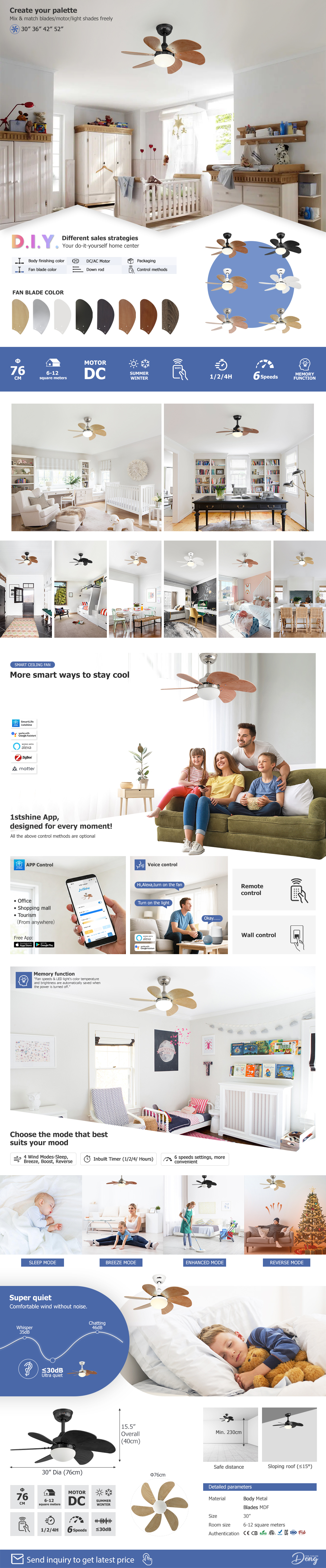Decorative Small LED Ceiling Fan Modern 6 Wood Blade Smart Remote Control Images |